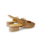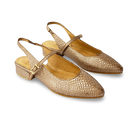 Zapato plano para mujer en cuero vacuno grabado y metalizado, con tacón bajo de 2 cm Aproximadamente que combina comodidad y estilo. Diseño con punta fina y cierre tipo slingback con hebilla ajustable para un calce perfecto. Hecho en Colombia, ideal para looks casuales y elegantes.