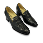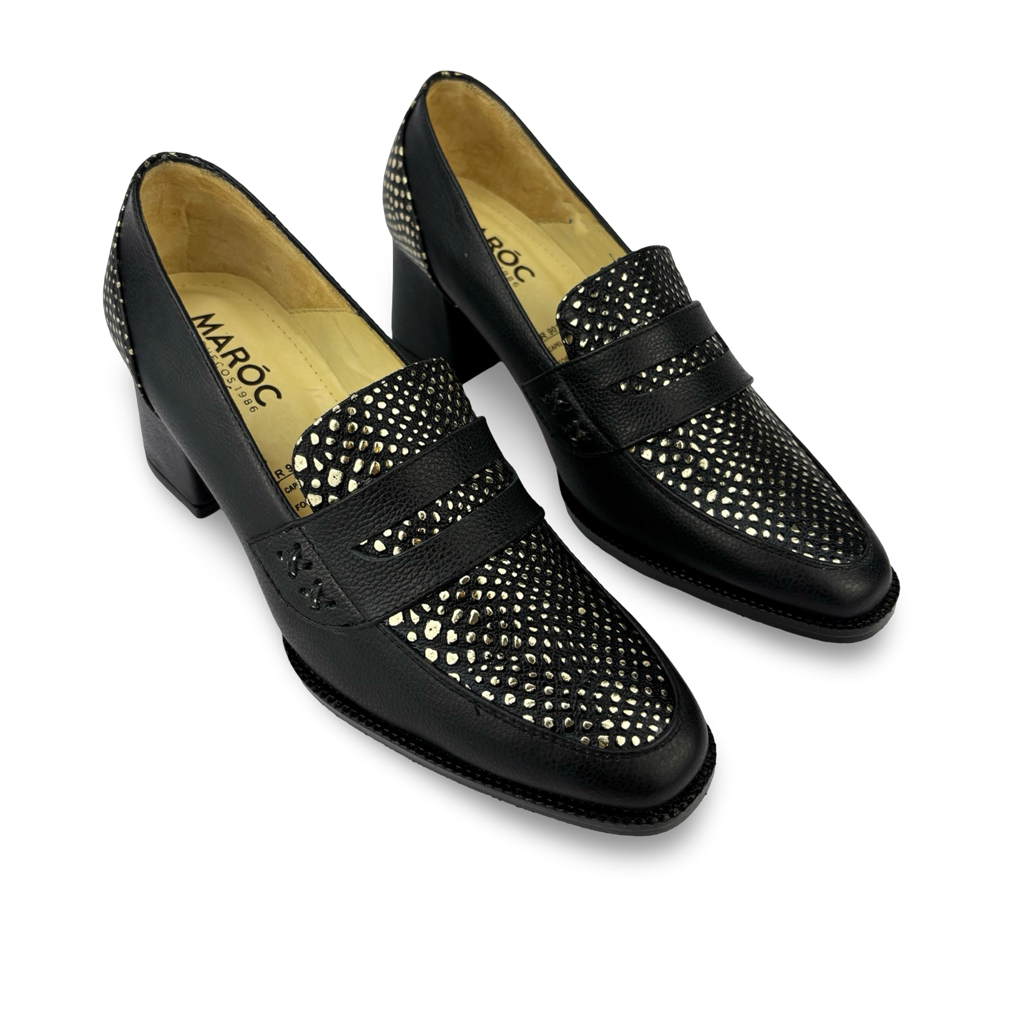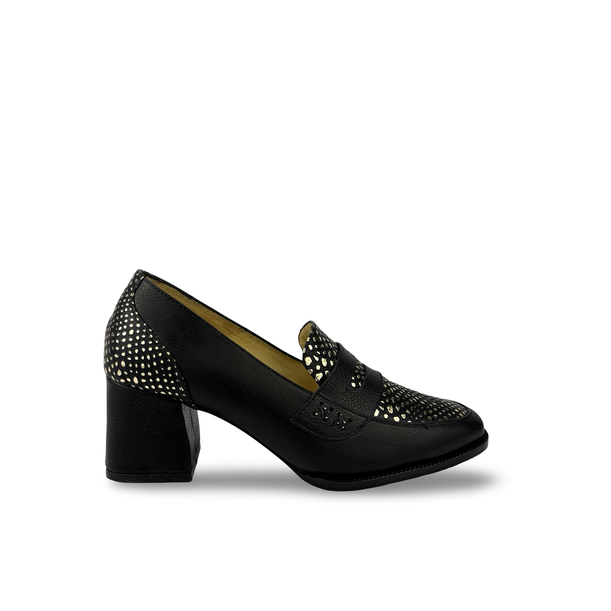 Tacón estilo mocasín para mujer elaborado en cuero vacuno liso y grabado, con antifaz decorativo en el empeine que realza su diseño clásico y sofisticado.