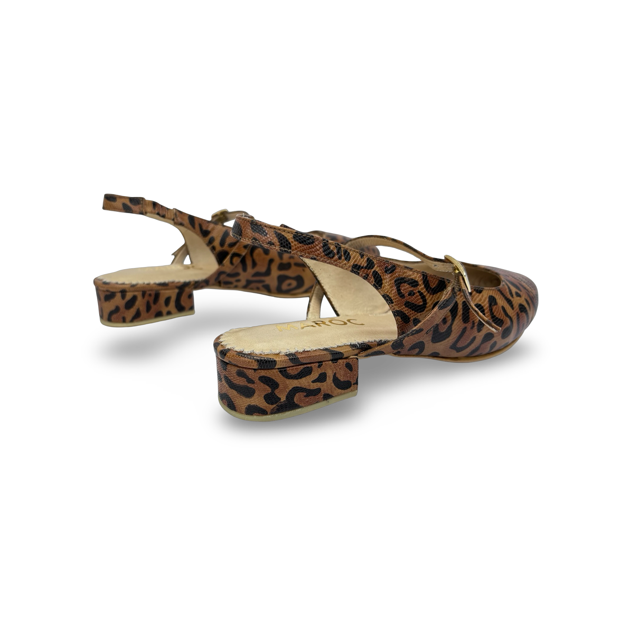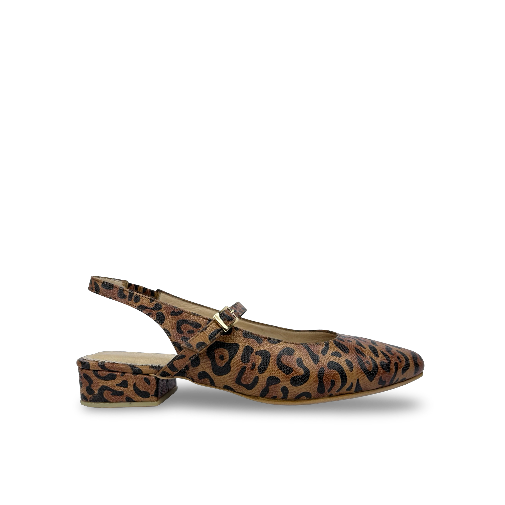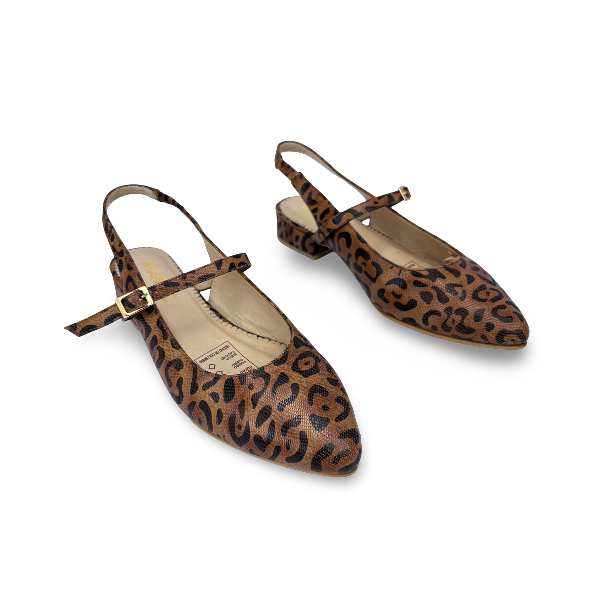 Zapato plano para mujer en cuero vacuno grabado y metalizado, con tacón bajo de 2 cm Aproximadamente que combina comodidad y estilo. Diseño con punta fina y cierre tipo slingback con hebilla ajustable para un calce perfecto. Hecho en Colombia, ideal para looks casuales y elegantes.