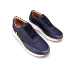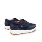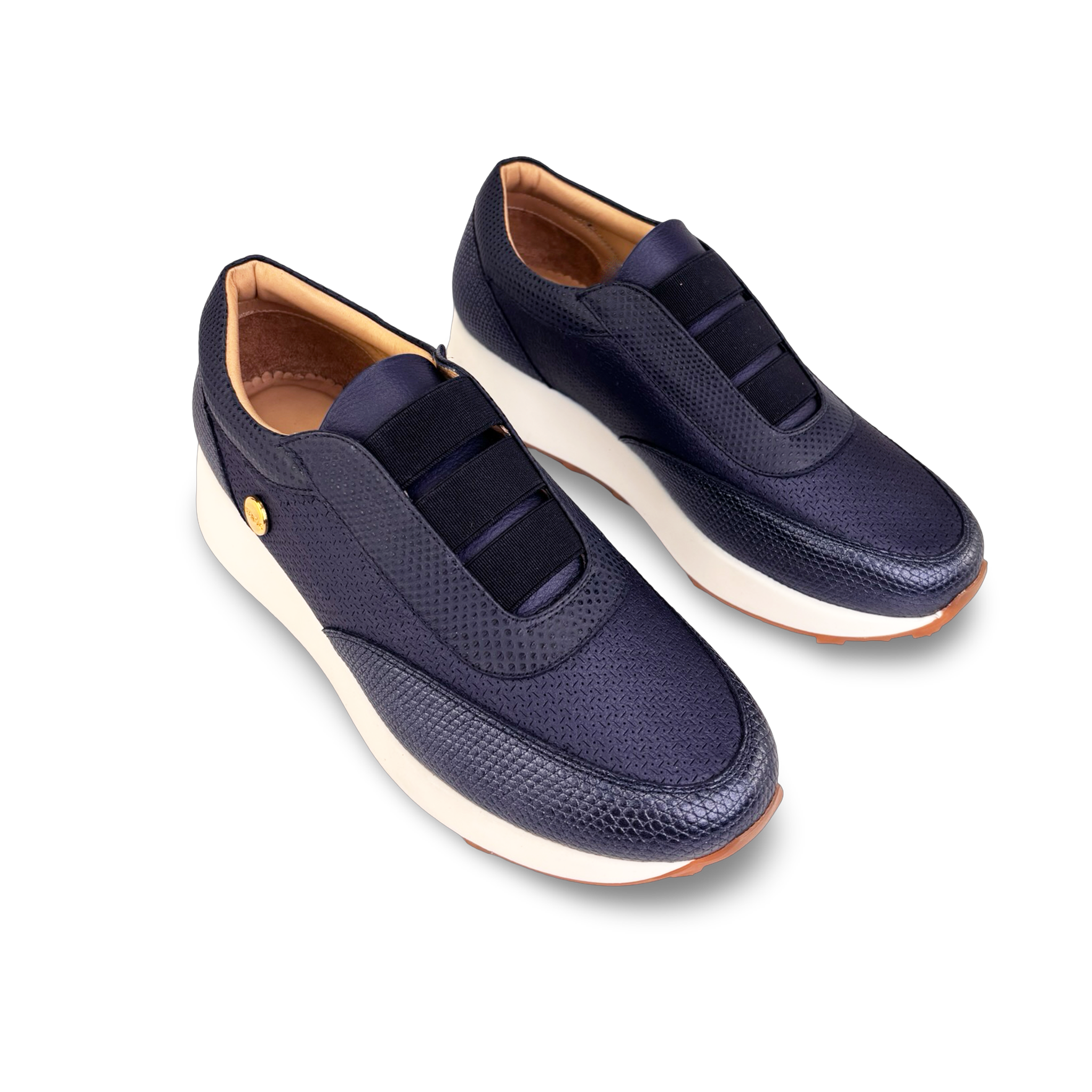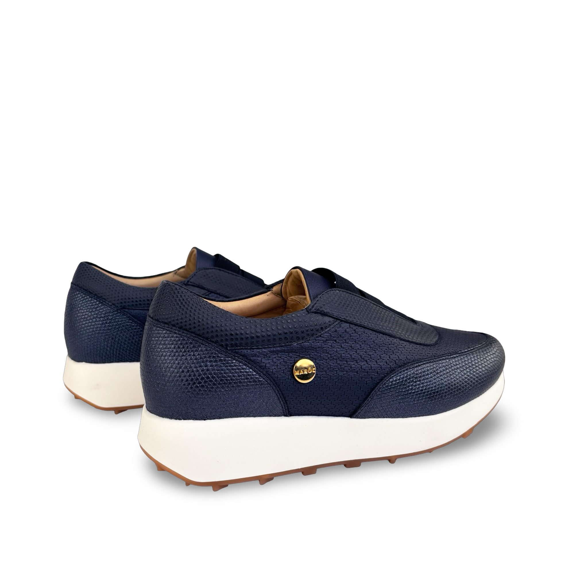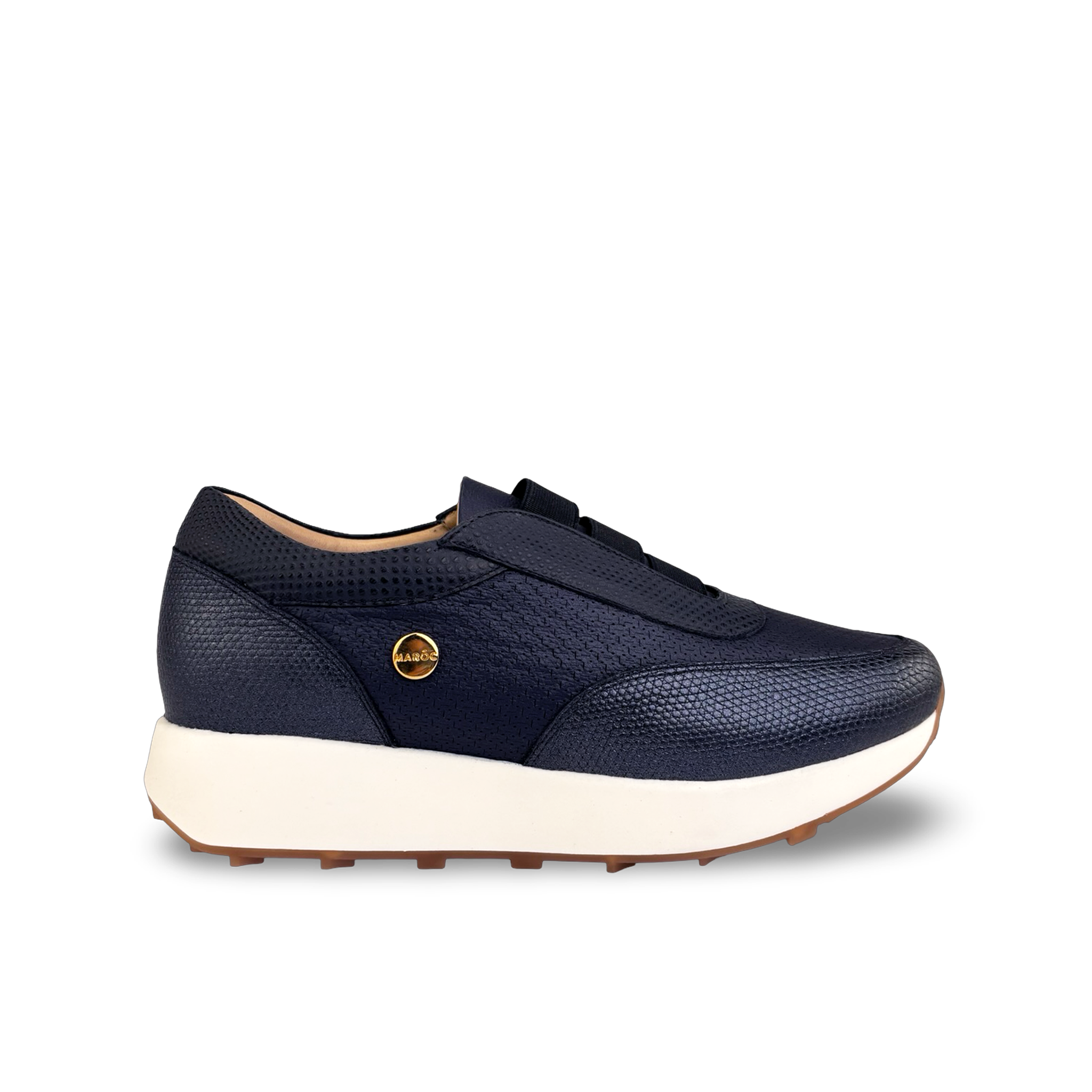 Women's tennis shoe without lace; made of leather; combination of textures; finish: (metallic matte leather and die-cut with designs, engraved leather and metallic engraved leather); elastic instep for a better fit and easy placement; semi-sports sole with low platform and contrast color; metallic appliqué on the external side; Maróc brand