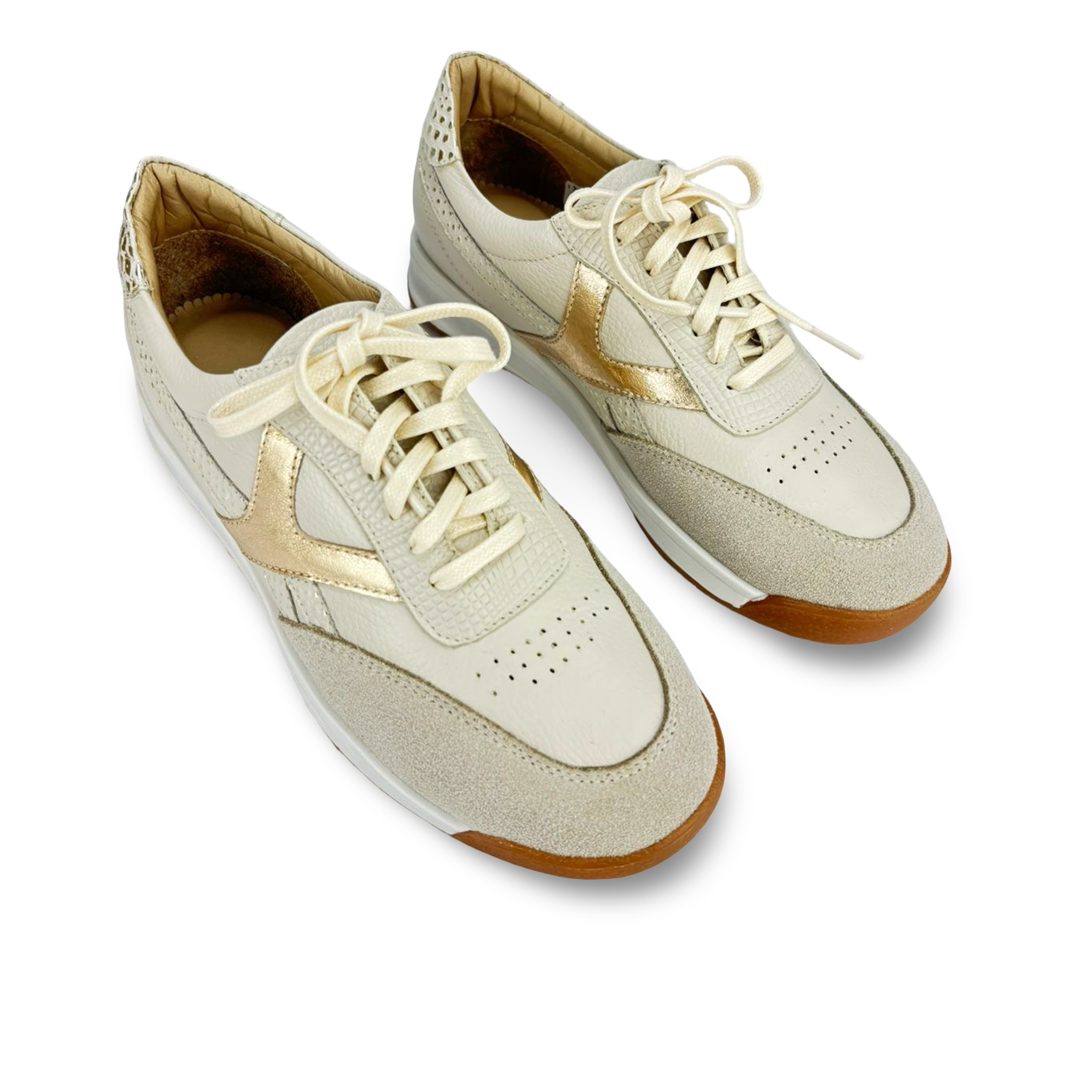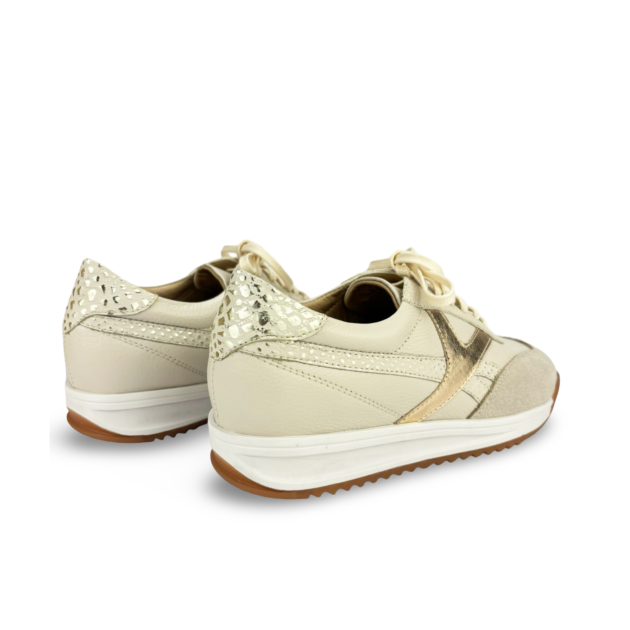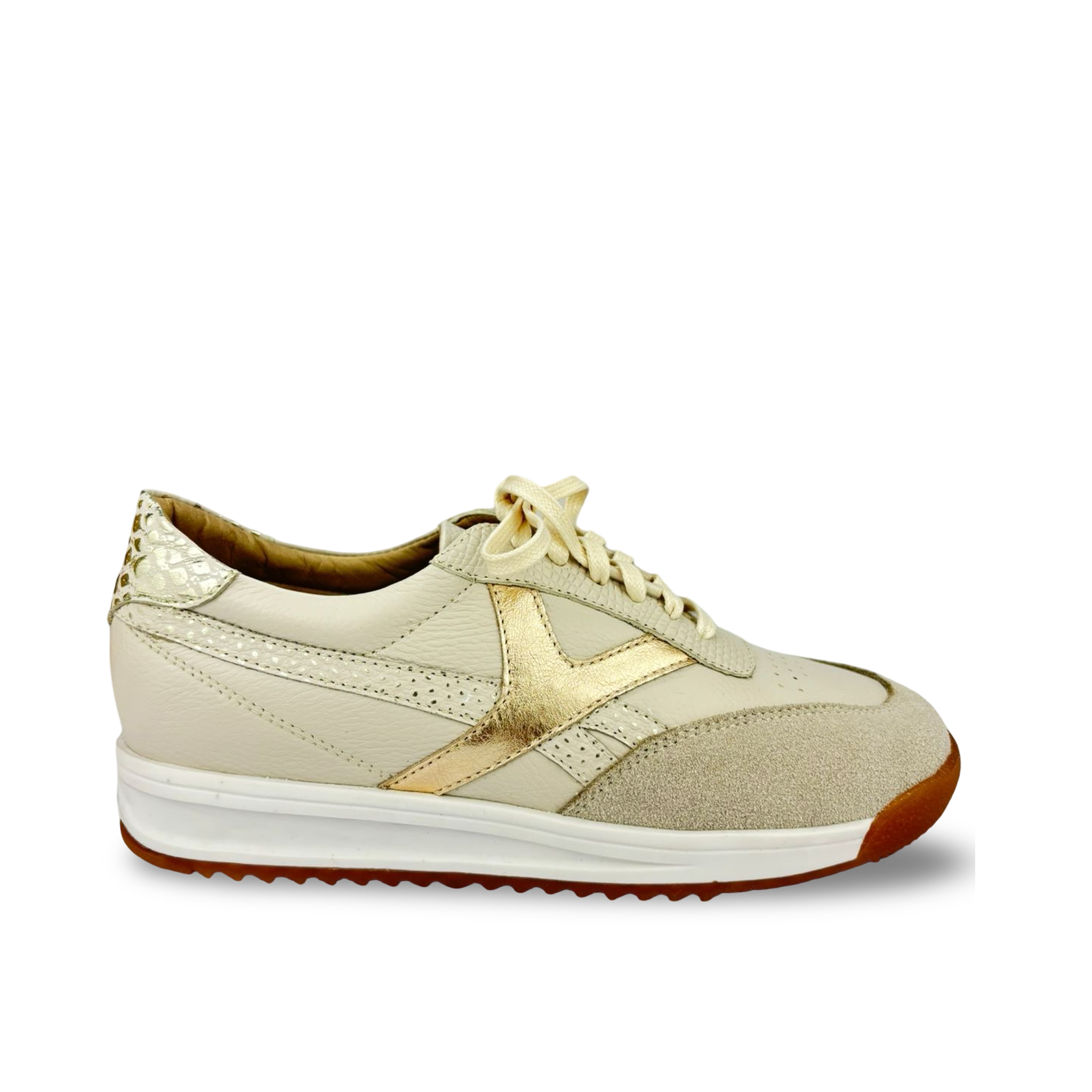 Diseño, confort y estilo se unen en los tenis para mujer REF 119097 de MAROC 1986, elaborados en cuero genuino con delicados acabados en tonos crema, dorado y beige. Su diseño exclusivo combina materiales de alta calidad con texturas contrastantes que elevan tu look diario con un toque deportivo-chic.
