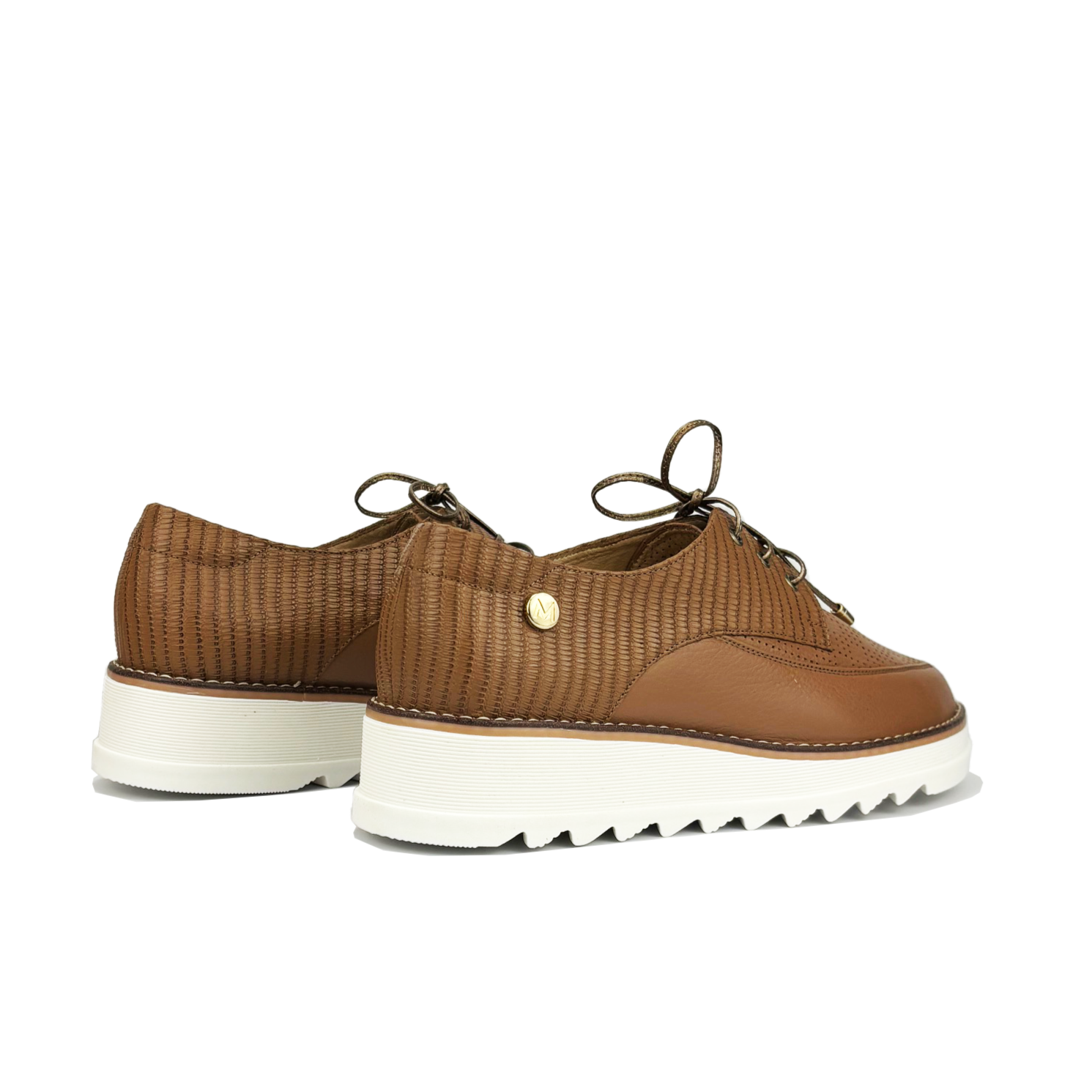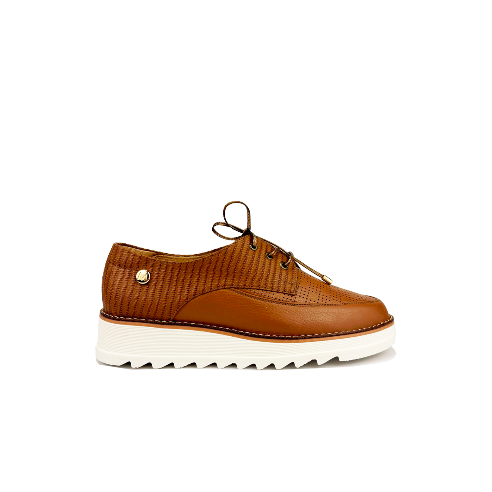 Woman shoe lacing; made of cowhide leather; semipointed; combination of textures (metallic and die-cut matte leather, crystal leather and engraved leather); flat with semi-circular platform; detail: leather cord in contrasting color with pointed bells; metallic appliqué on the external side; sole with good grip. Maroc Brand