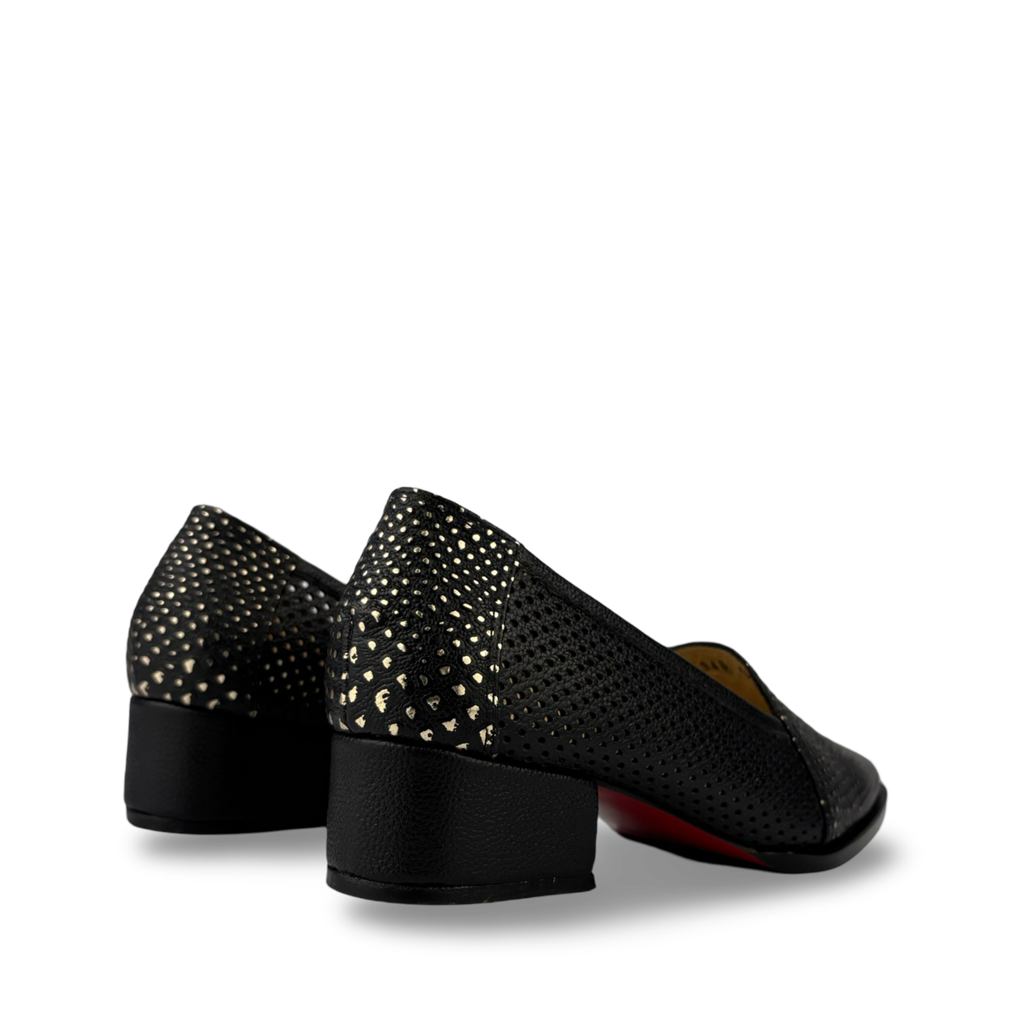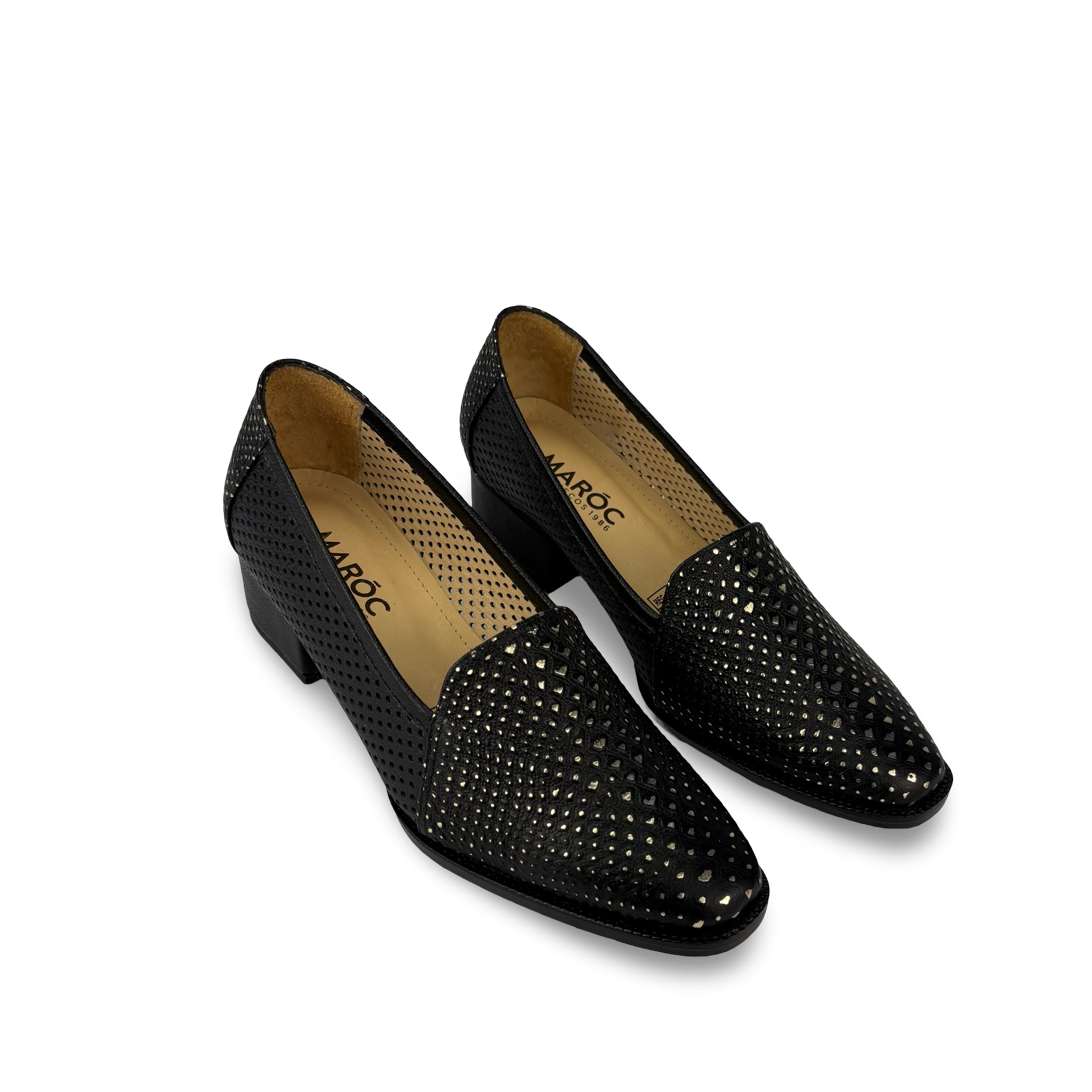 Los mocasines para mujer de Maroc combinan sofisticación y confort en un diseño ejecutivo Fabricados en 100% cuero vacuno grabado, metalizado y troquelado, destacan por su textura única y su elegante acabado brillante. Su tacón de 4 cm aporta una altura ideal para estilizar la figura sin perder comodidad, mientras que su punta fina y cierre slip-on garantizan un calce práctico y moderno. Perfectos para looks de oficina o salidas casuales, estos mocasines colombianos elevan cualquier outfit con su toque artesanal y refinado. Dimensiones aprox.: Tacón de 4 cm de alto.
