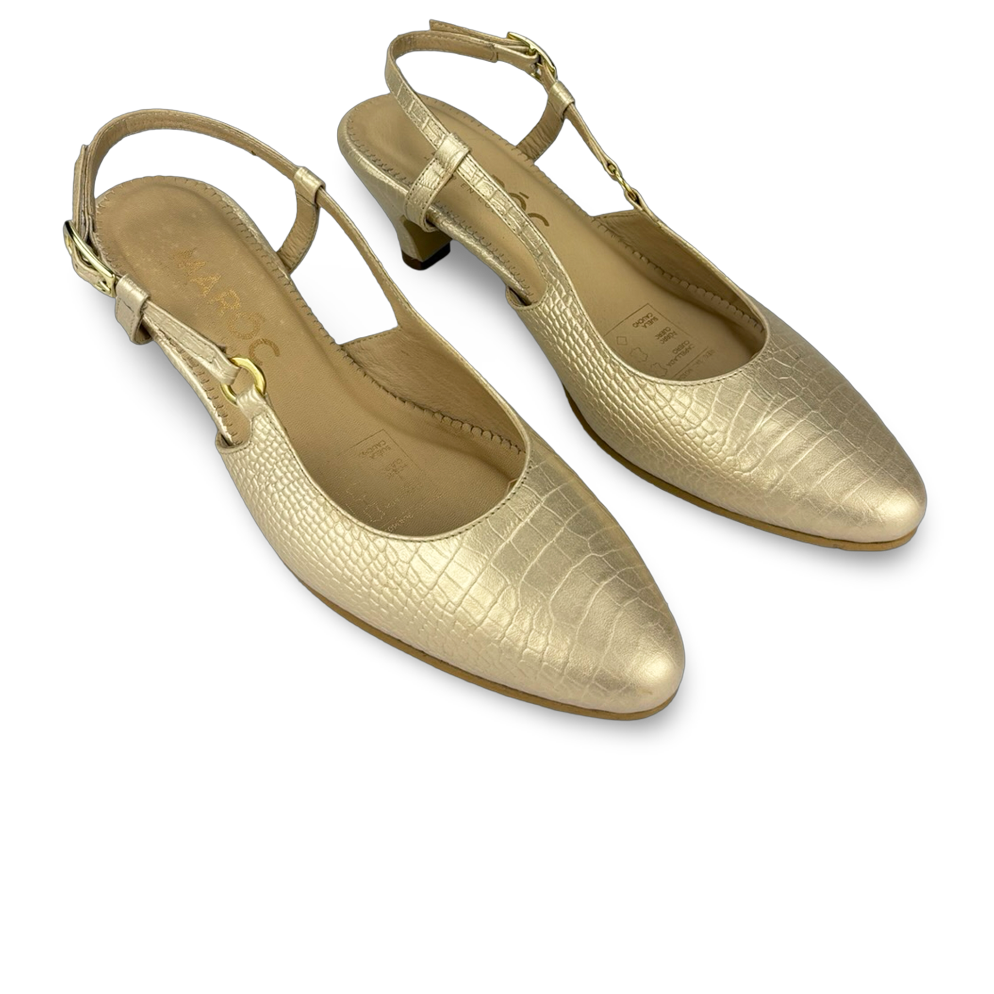 Tacón estilo atemporal con cierre slingback para mujer con diseño elegante y sofisticado. Presenta un aplique decorativo circular en la capellada, tacón de 5 cm recubierto en cuero texturizado y punta estilizada. Elaborado 100% en cuero vacuno grabado con forro de cuero y suela en caucho para mayor comodidad. Fabricado en Colombia.