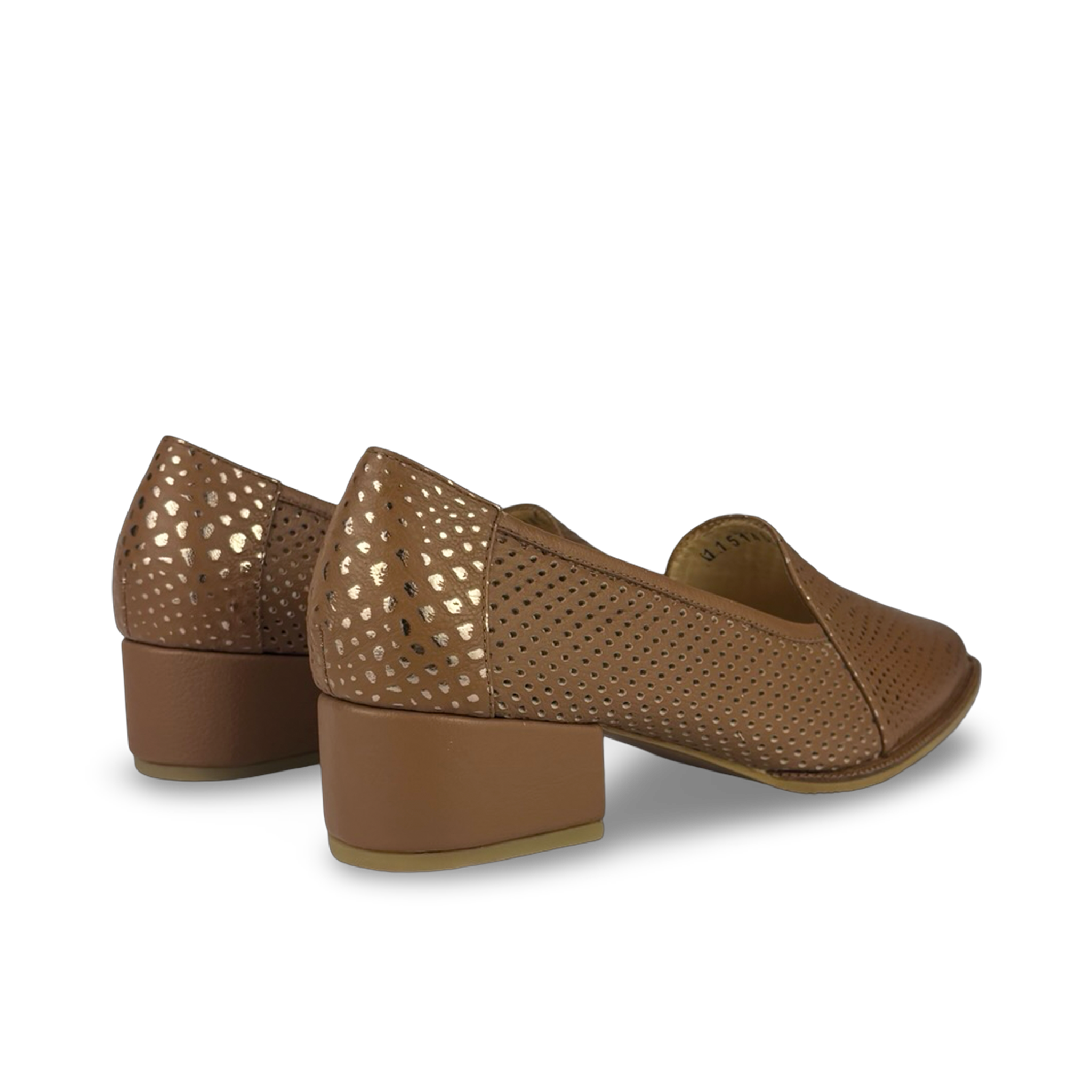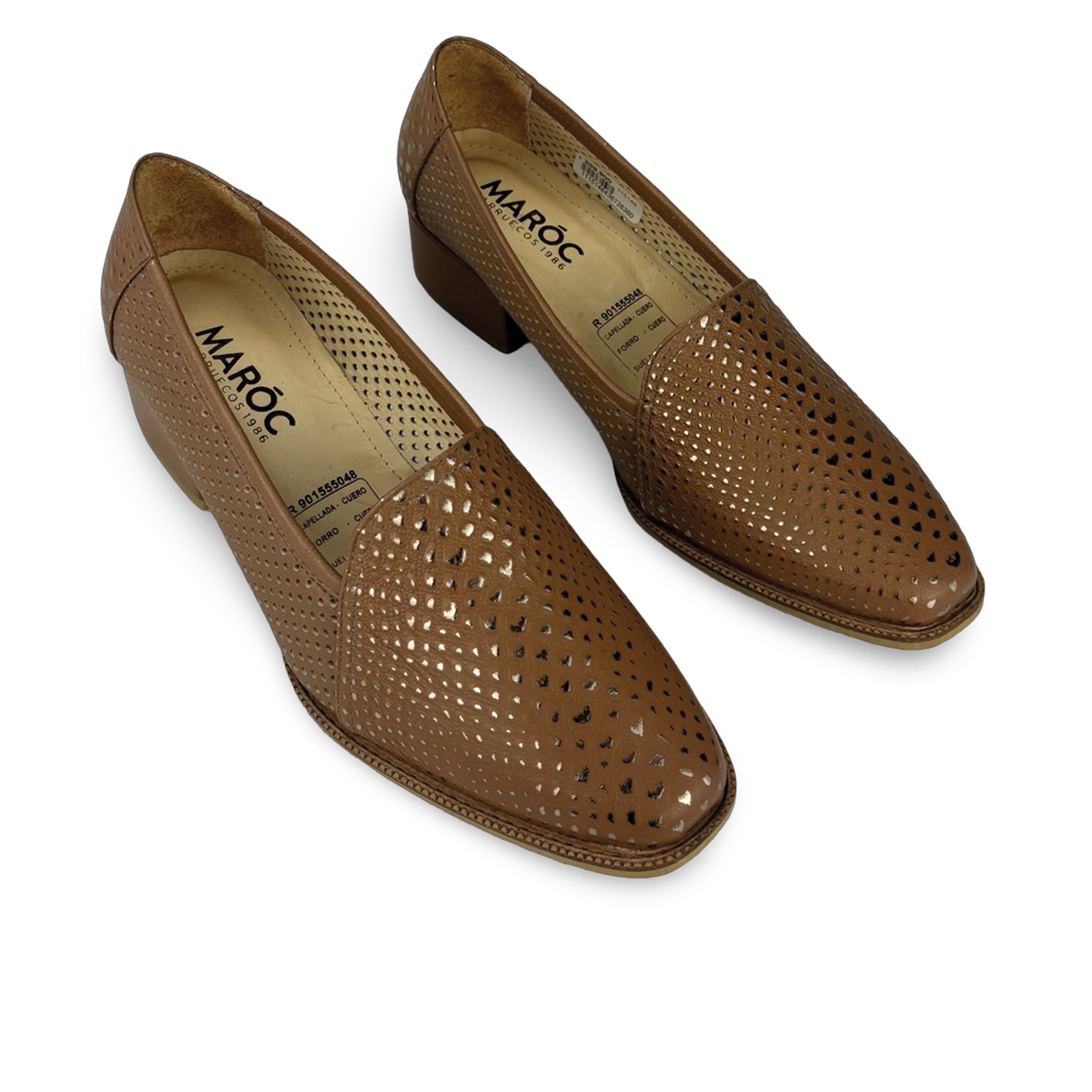 Los mocasines para mujer de Maroc combinan sofisticación y confort en un diseño ejecutivo Fabricados en 100% cuero vacuno grabado, metalizado y troquelado, destacan por su textura única y su elegante acabado brillante. Su tacón de 4 cm aporta una altura ideal para estilizar la figura sin perder comodidad, mientras que su punta fina y cierre slip-on garantizan un calce práctico y moderno. Perfectos para looks de oficina o salidas casuales, estos mocasines colombianos elevan cualquier outfit con su toque artesanal y refinado. Dimensiones aprox.: Tacón de 4 cm de alto.