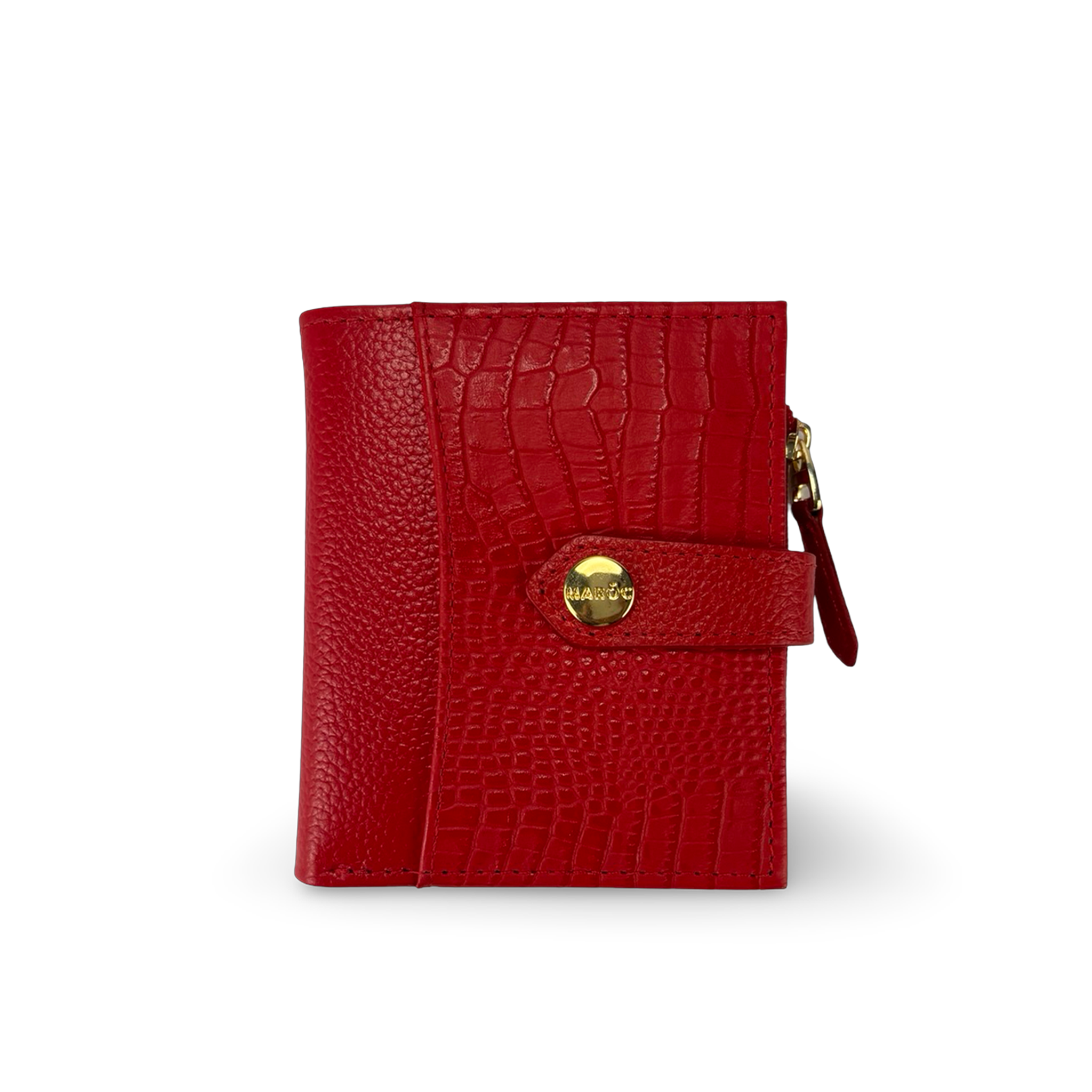 Billetera para mujer en cuero vacuno grabado, con elegante aplique metálico dorado logo Maroc en la parte frontal. Su diseño compacto y funcional cuenta con 6 compartimentos para tarjetas, un espacio para billetes, ventanilla para documentos y monedero lateral con cierre de cremallera. Con botón a presión que asegura tus pertenencias, es un accesorio sofisticado, práctico y resistente. Hecho en Colombia con herrajes de calidad y forro interno en poliéster. cuenta con Bloqueo RFID Para mantener tus documentos a salvo