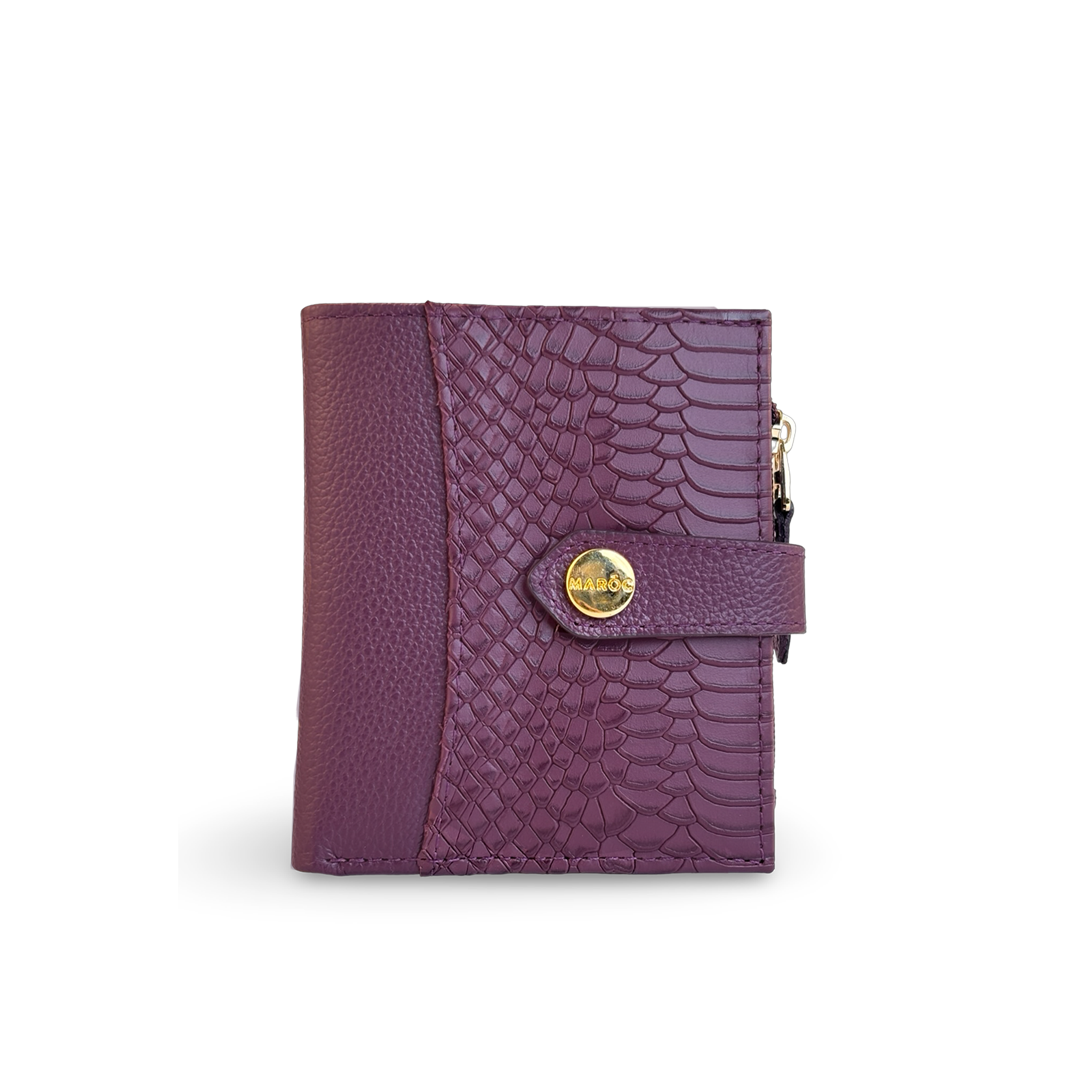 Billetera para mujer en cuero vacuno grabado, con elegante aplique metálico dorado logo Maroc en la parte frontal. Su diseño compacto y funcional cuenta con 6 compartimentos para tarjetas, un espacio para billetes, ventanilla para documentos y monedero lateral con cierre de cremallera. Con botón a presión que asegura tus pertenencias, es un accesorio sofisticado, práctico y resistente. Hecho en Colombia con herrajes de calidad y forro interno en poliéster. cuenta con Bloqueo RFID Para mantener tus documentos a salvo