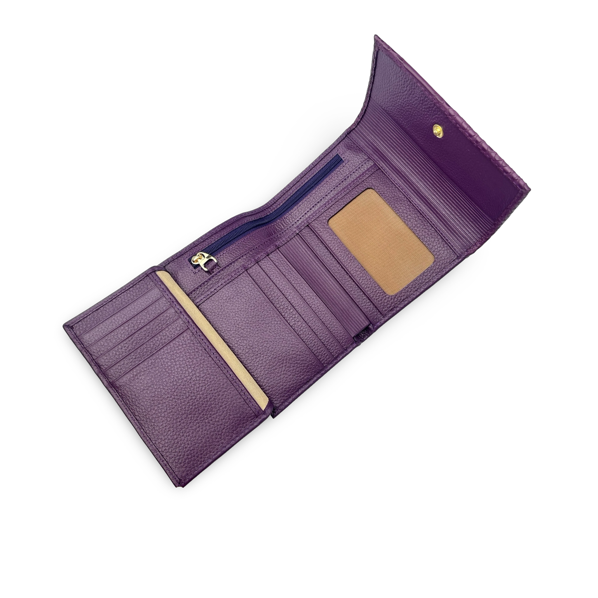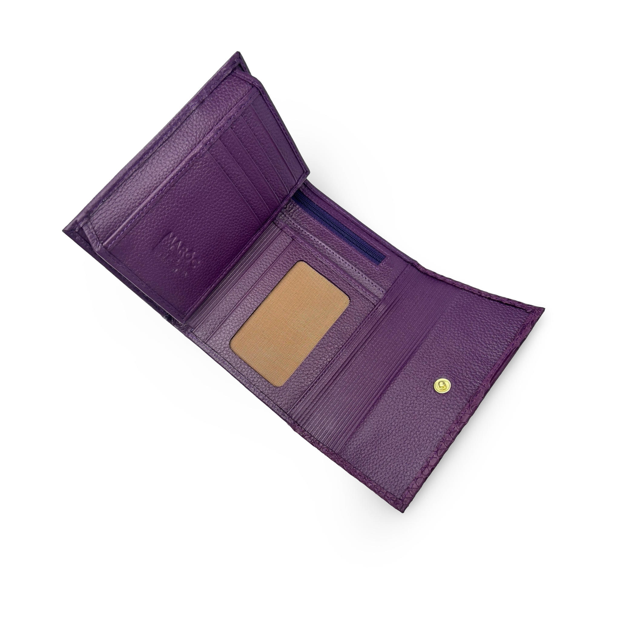 Billetera para mujer elaborada en 100% cuero vacuno liso y grabado, diseñada para ofrecer organización, seguridad y estilo. Cuenta con 16 compartimentos para tarjetas, doble fuelle para billetes, monedero interno y externo con cremallera, además de ventanas transparentes para fotos o documentos. Su cierre con botón a presión y el sistema RFID Blocker garantizan protección y practicidad en todo momento.