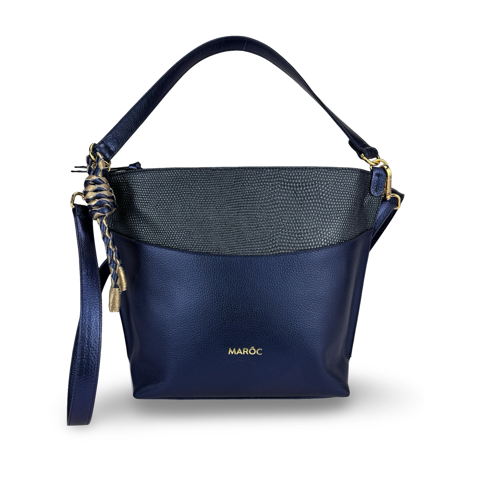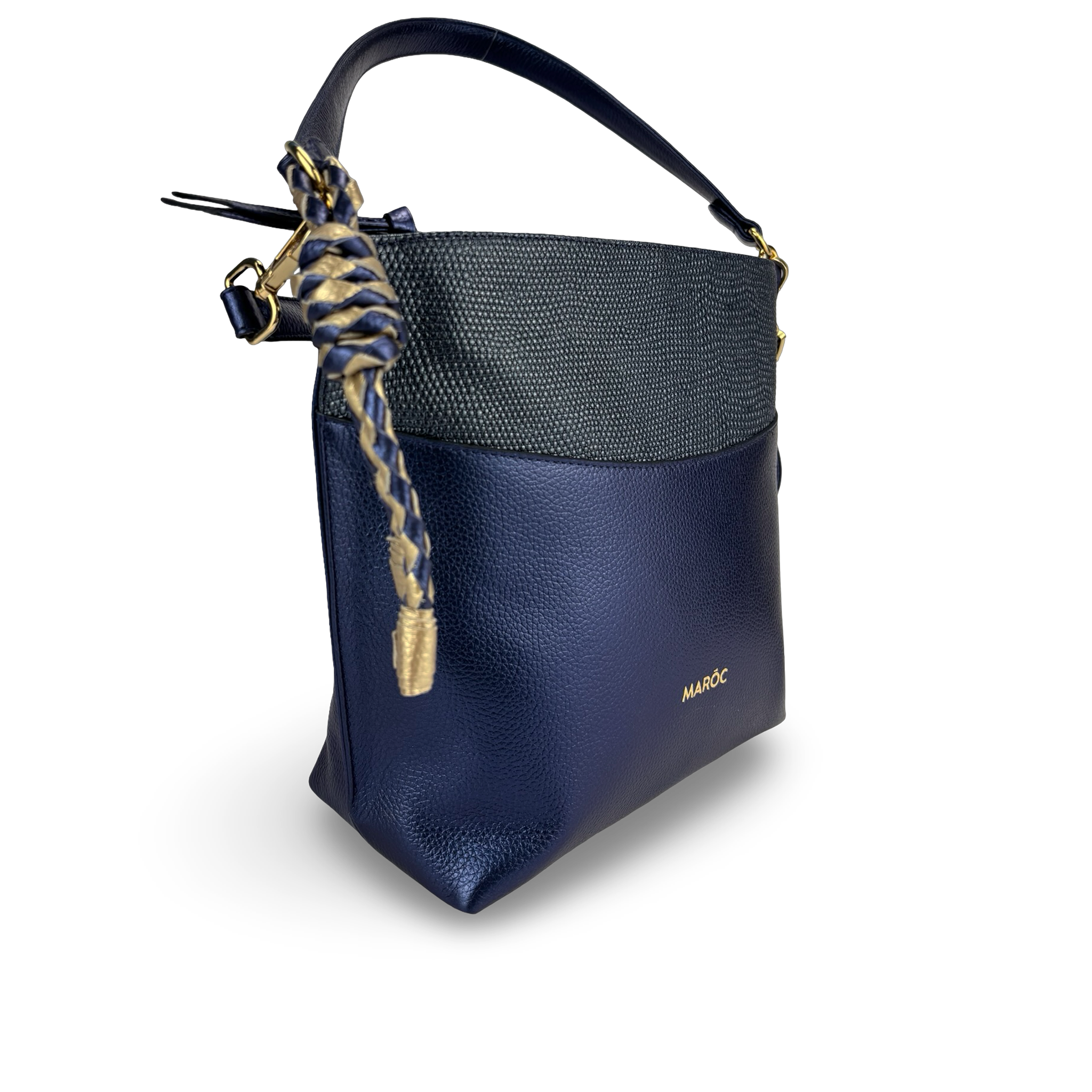 - Tipo: Bolso tipo Bucket para mujer con borla decorativa y aplique decorativo en dorado logo marca Maroc, lo puedes llevar de dos formas como bolso de hombro y bolso cruzado