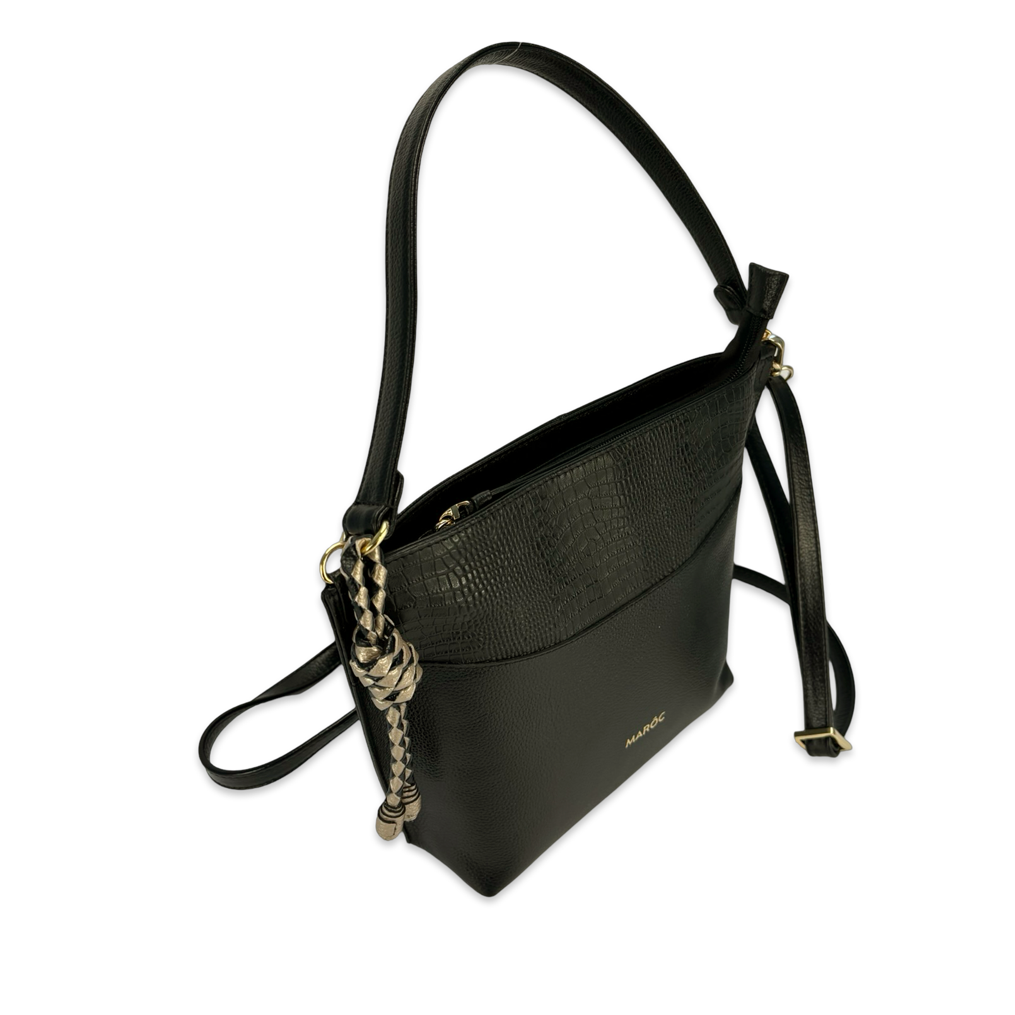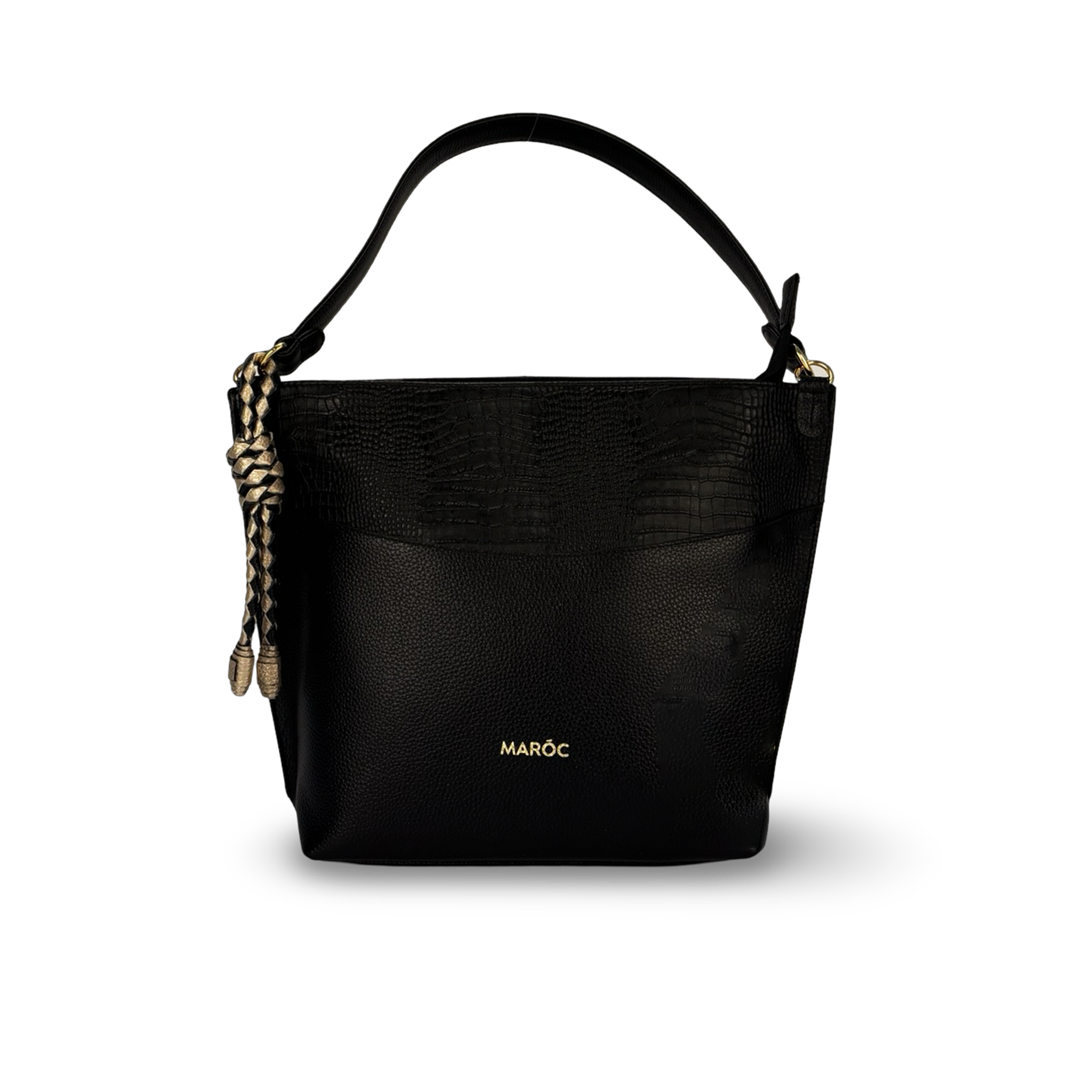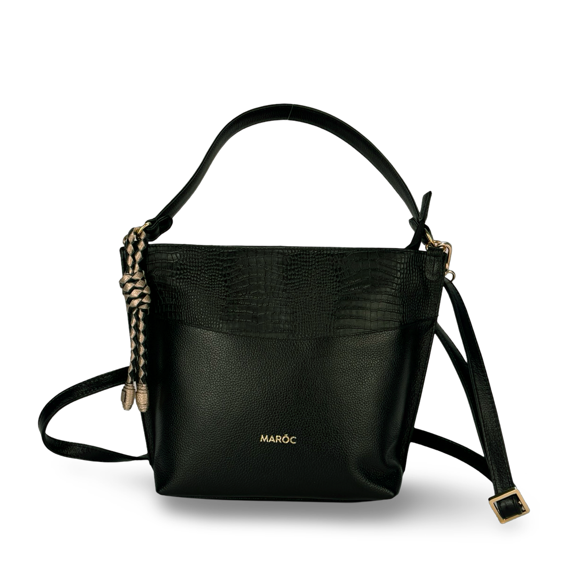 - Tipo: Bolso tipo Bucket para mujer con borla decorativa y aplique decorativo en dorado logo marca Maroc, lo puedes llevar de dos formas como bolso de hombro y bolso cruzado