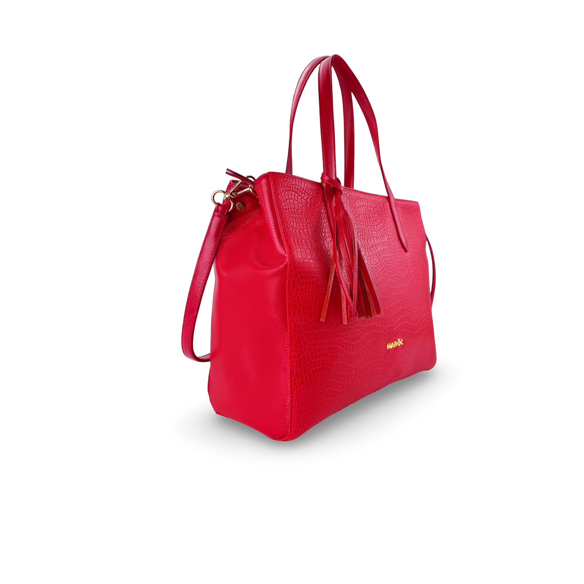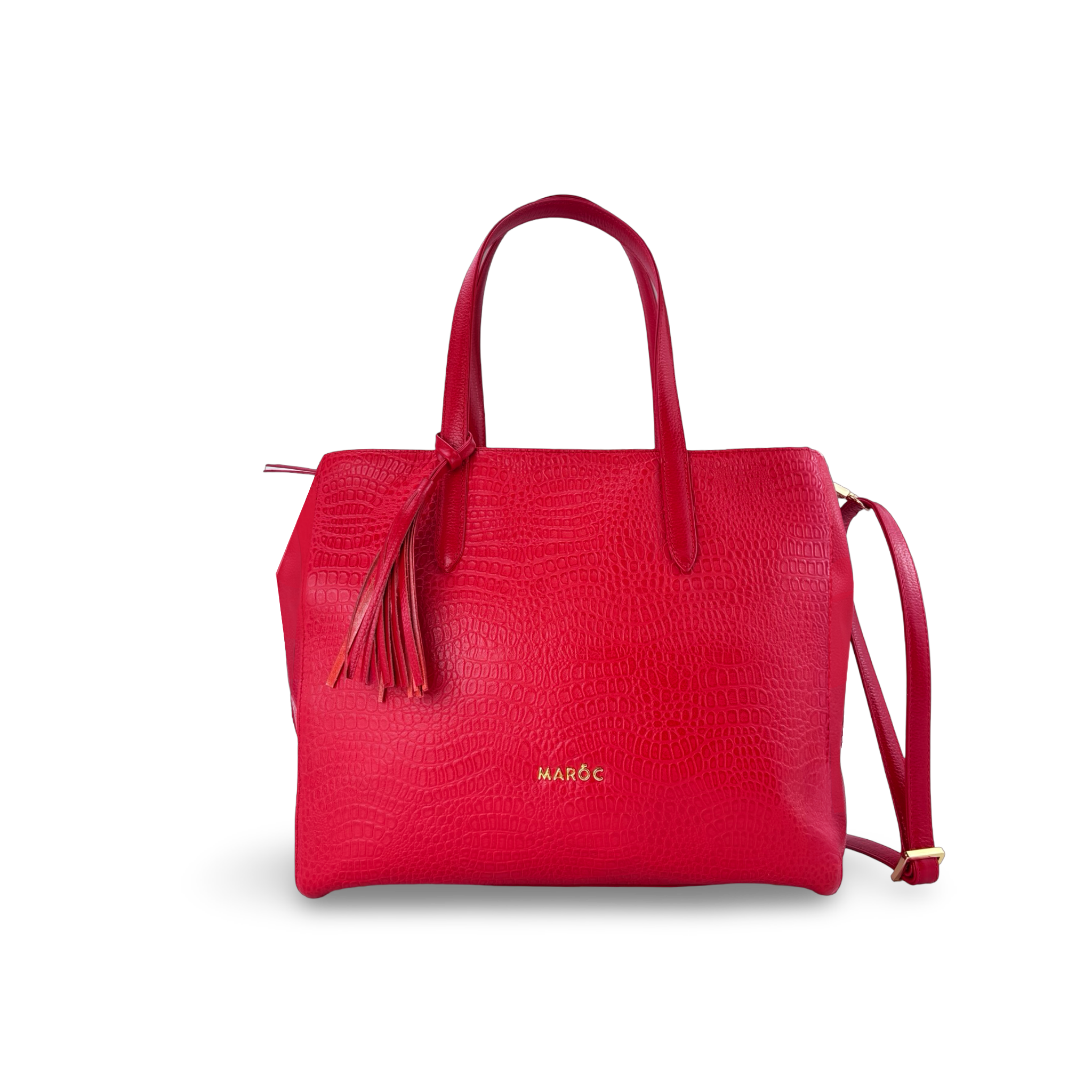 - Tipo: Bolso estilo Shopper con asas y con bandolera ajustable, borla decorativa y aplique metálico del logo Maroc en la parte frontal del bolso, contiene un portallaves tipo mosquetón interno