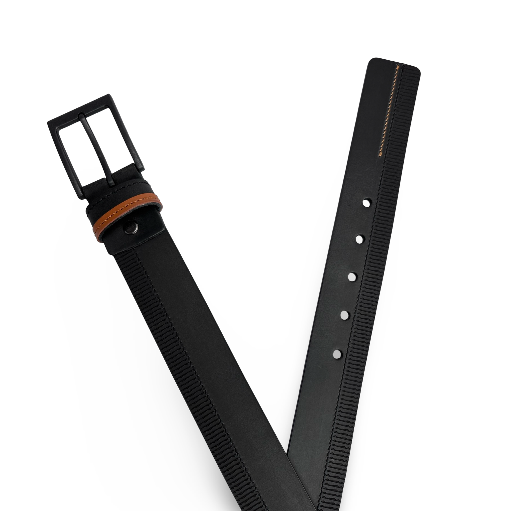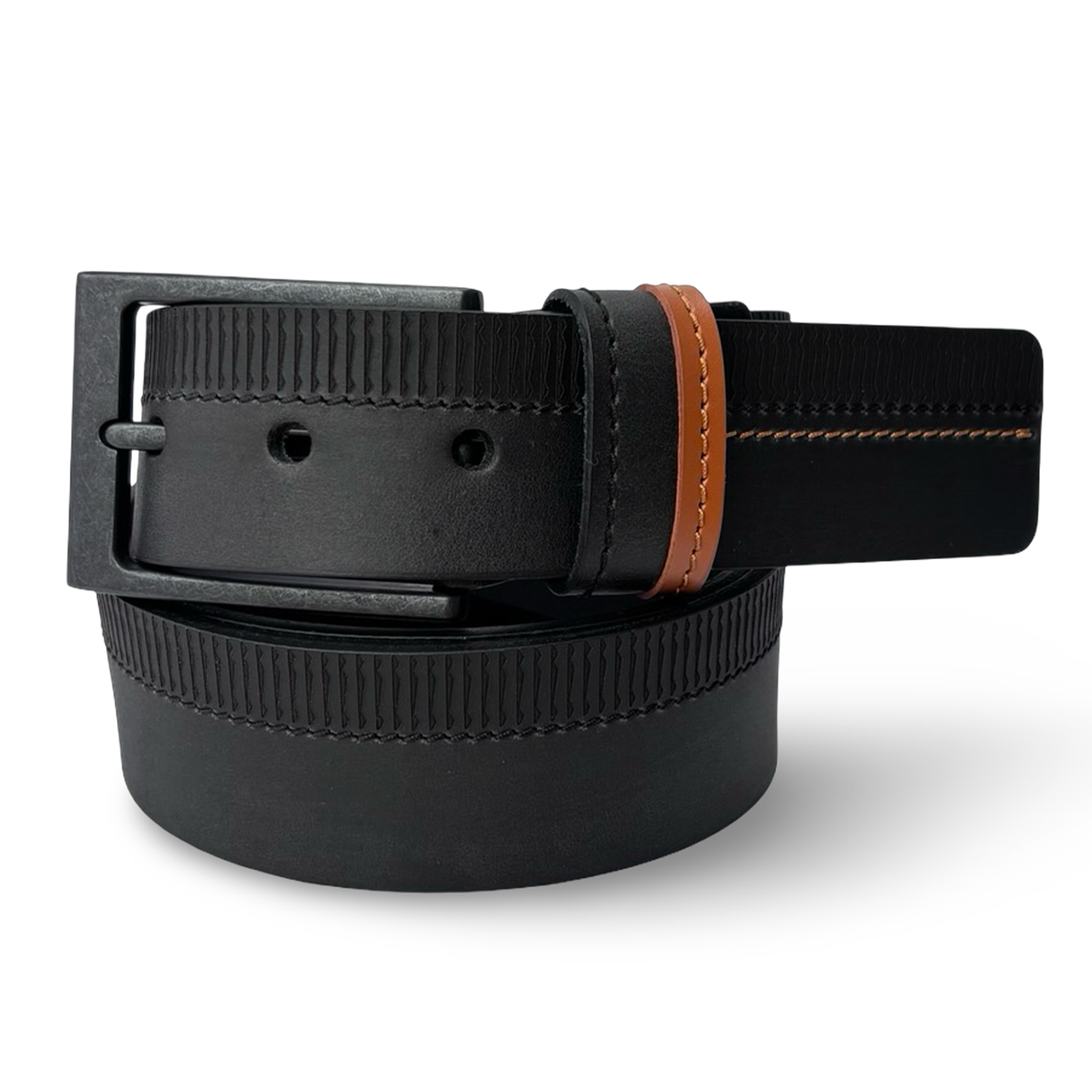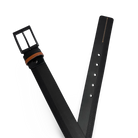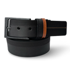 - Tipo: Cinturón para hombre con grabado en el lateral y detalle de costura color naranja