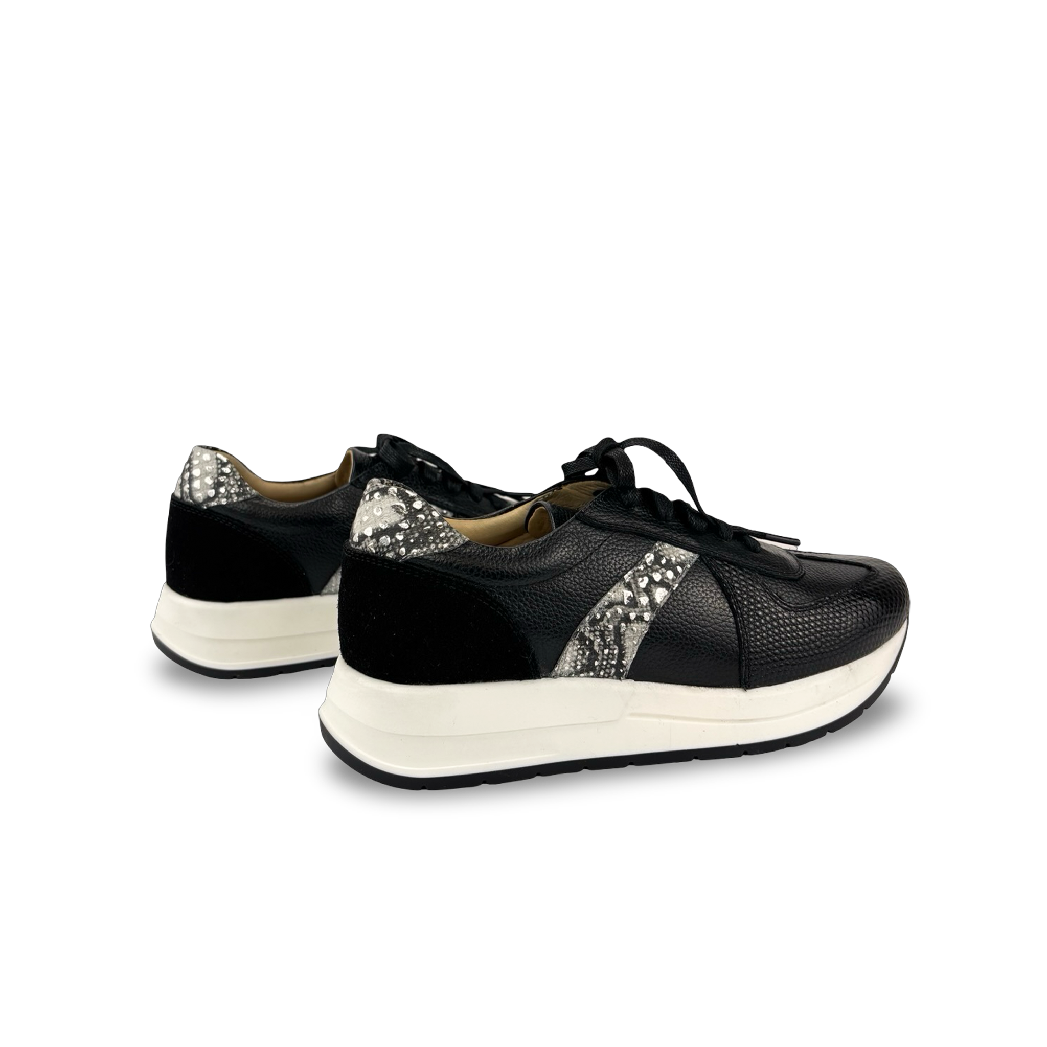 Tenis para mujer de estilo moderno y versátil, perfectos para un look casual con un toque semiformal. Elaborados en 100% cuero vacuno liso, grabado y metalizado, destacan por su mezcla de texturas y acabado brillante que eleva cualquier outfit. Su suela de caucho antideslizante de 3 cm brinda comodidad y estabilidad durante todo el día, mientras que el cordón encerado añade un detalle sofisticado. Dimensiones: Suela 3 cm de alto aproximadamente